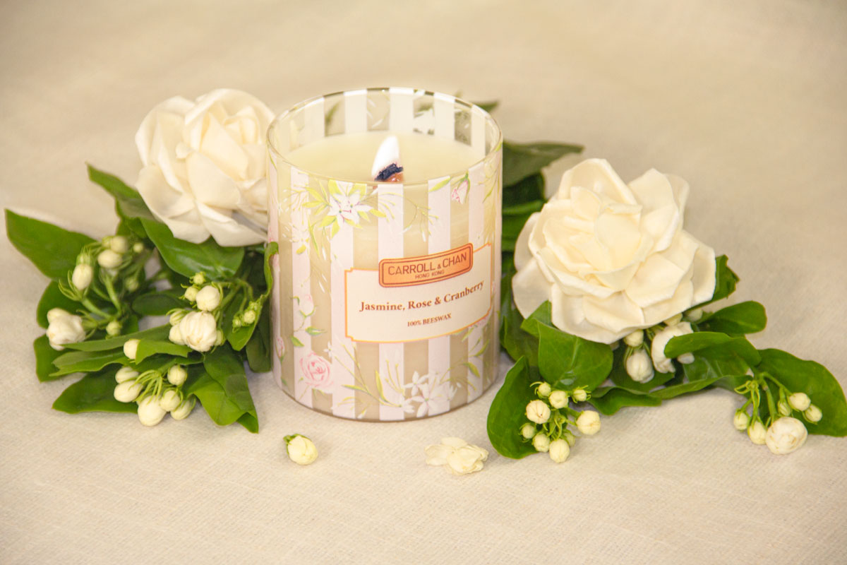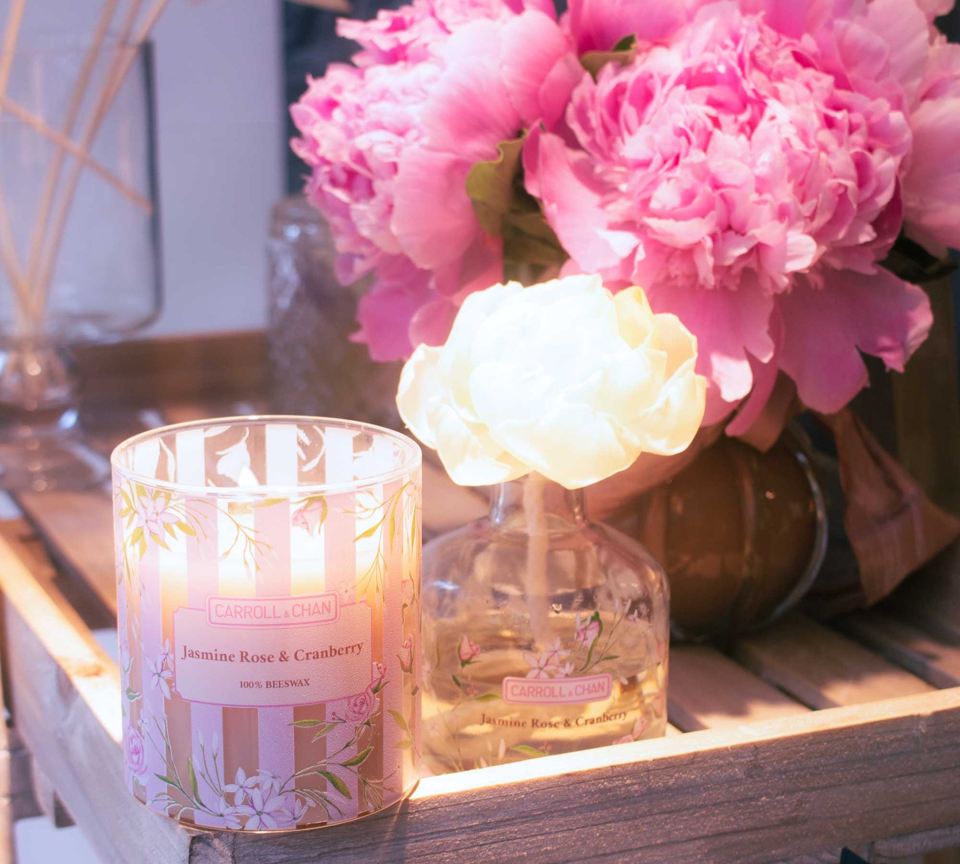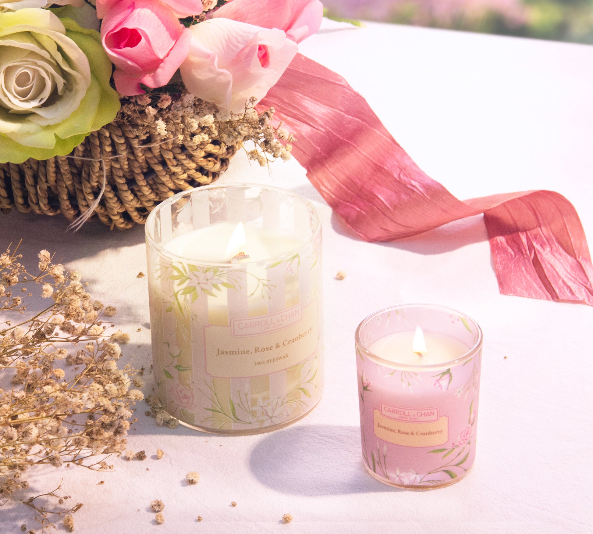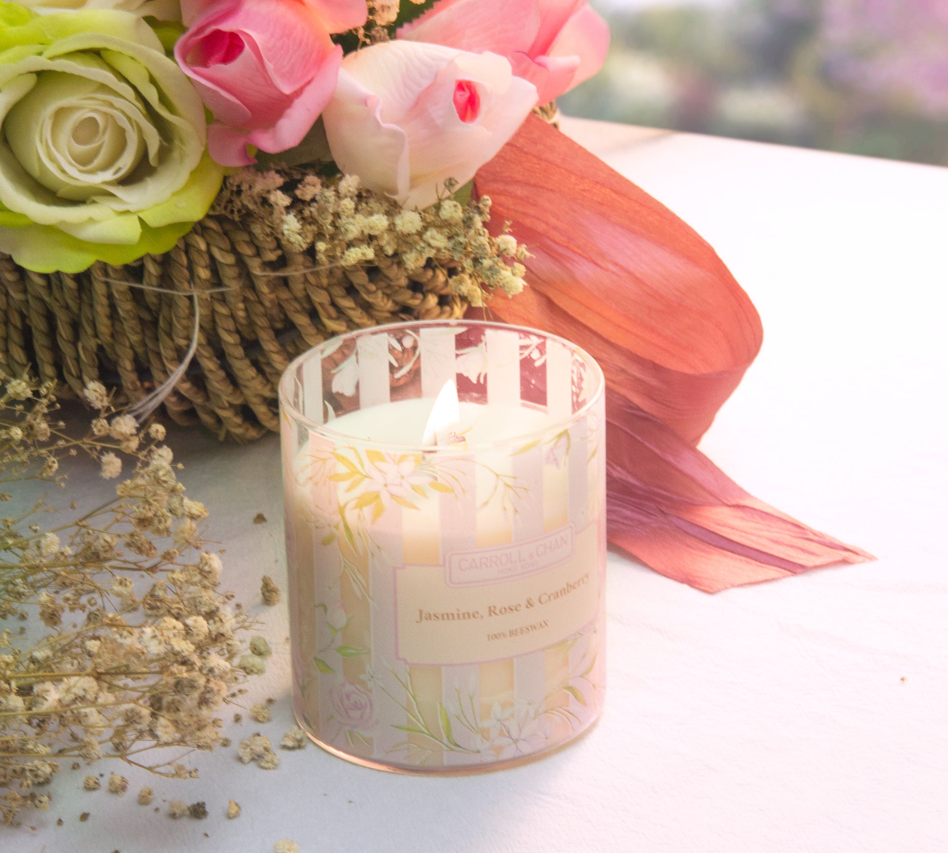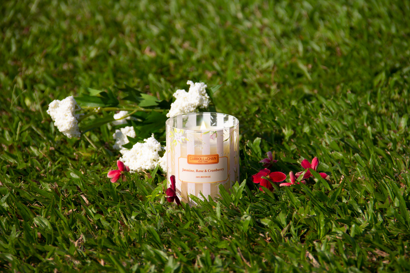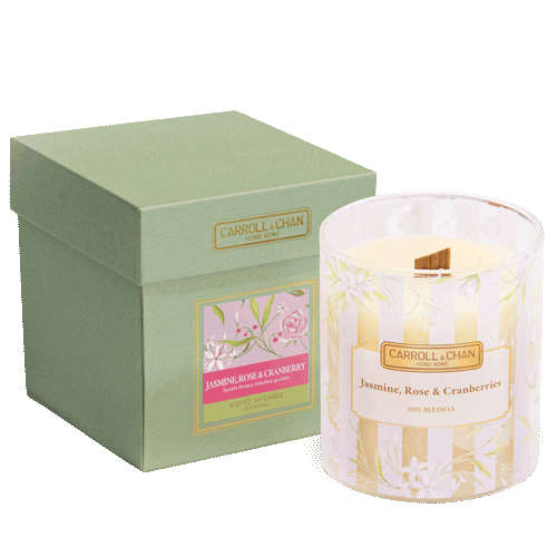 شمعة الياسمين والورد والتوت البري مصنوعة من شمع العسل بنسبة 100% ومصنوعة من فتيل خشبي معتمد من مجلس رعاية الغابات ومستدام المصدر وخفيف الاشتعال. وهي معبأة في وعاء زجاجي معاد تدويره جزئيًا بغطاء من الخيزران المستدام ومقدمة في صندوق هدايا فاخر خالٍ من البلاستيك.
