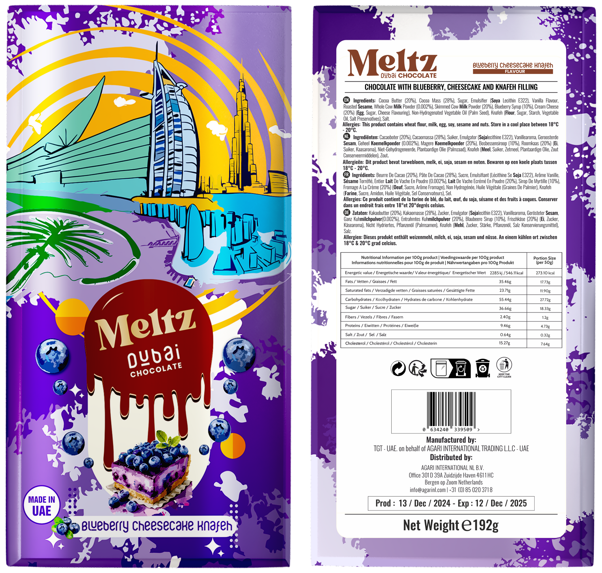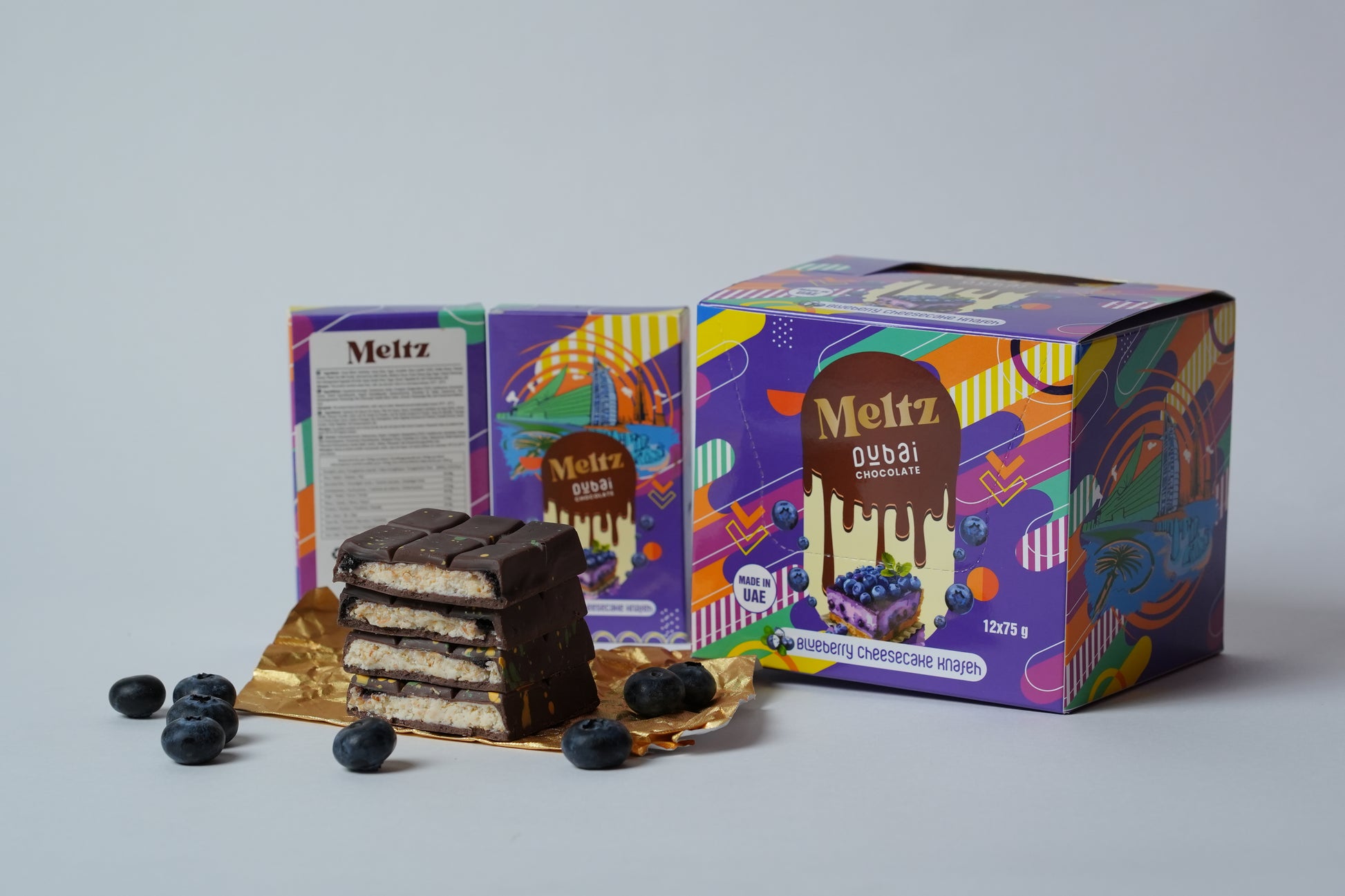 A delicious Blueberry Cheesecake Knafeh 192g wrapped in premium Meltz chocolate.