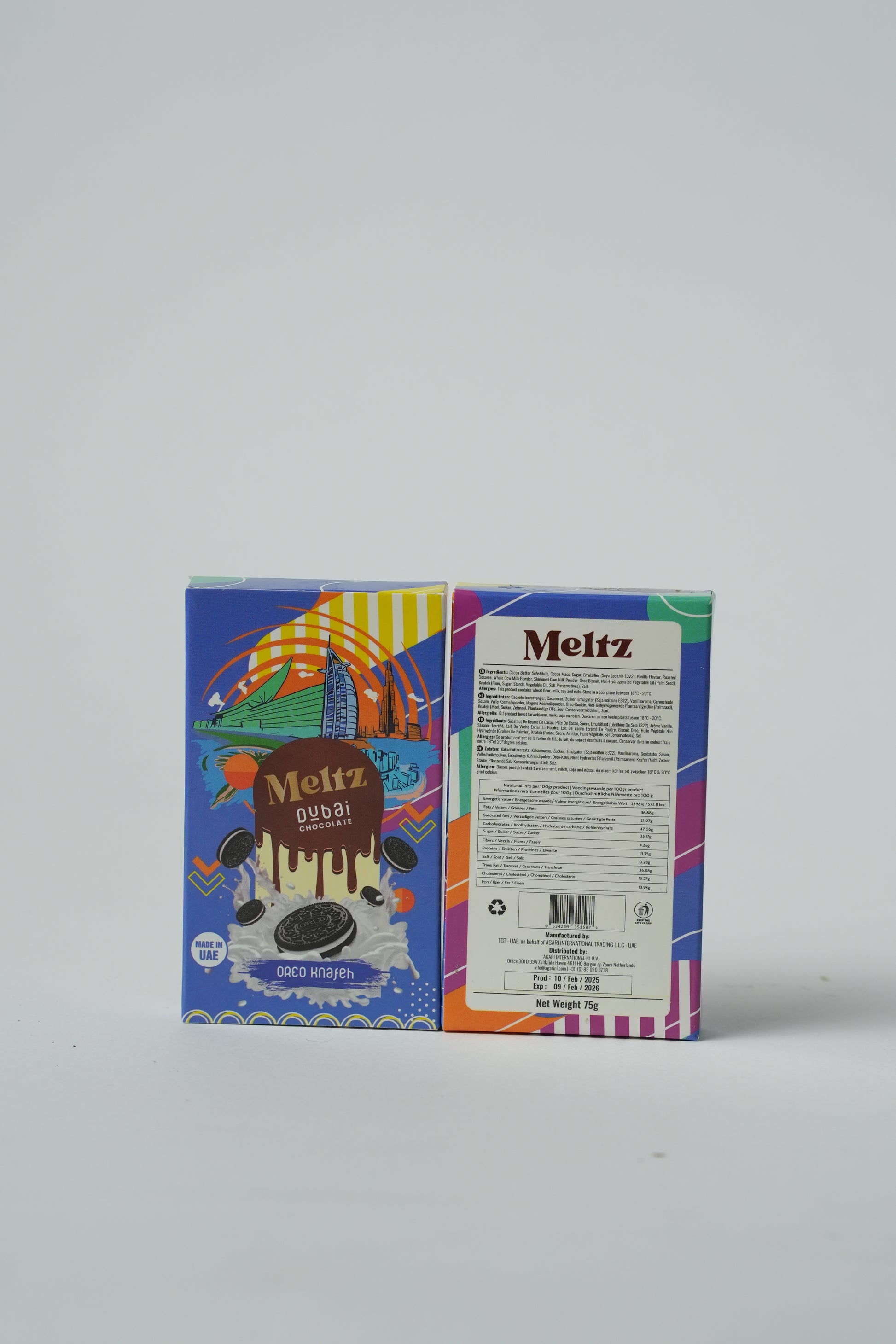 A crowd favorite — crushed cookies and creamy filling layered in compound Meltz chocolate and crispy knafeh. Size: 75g.