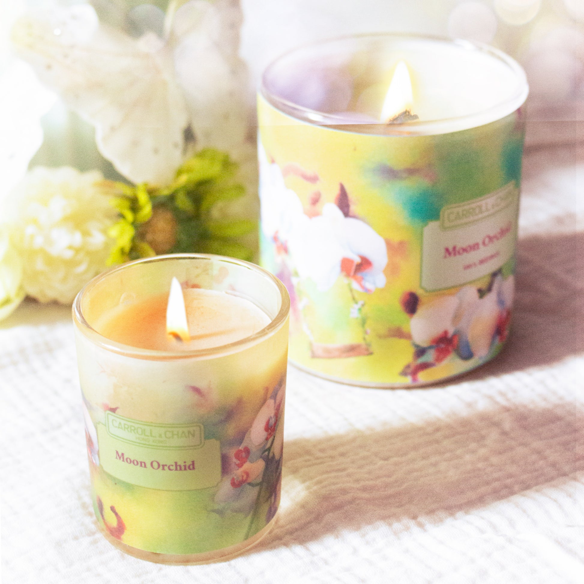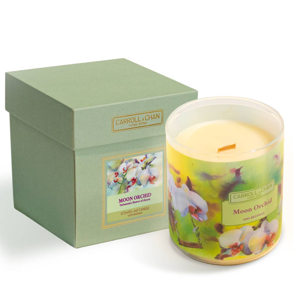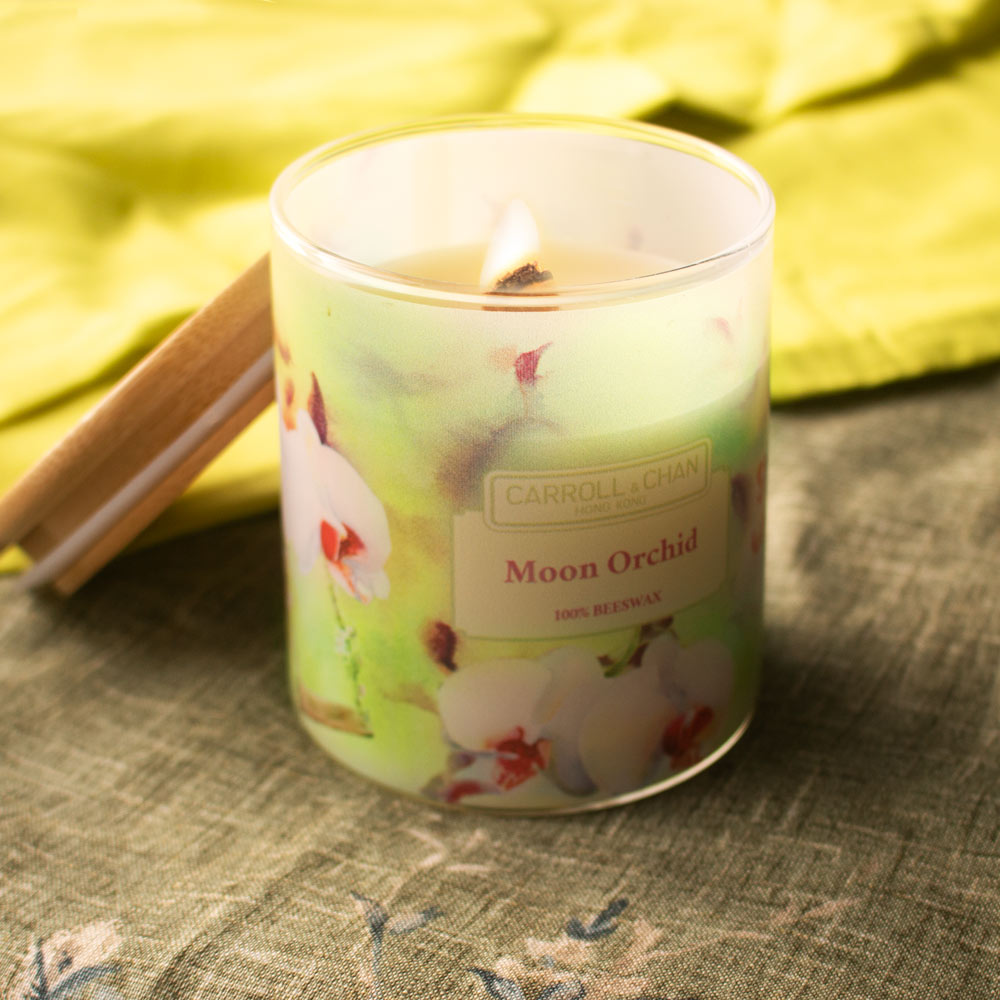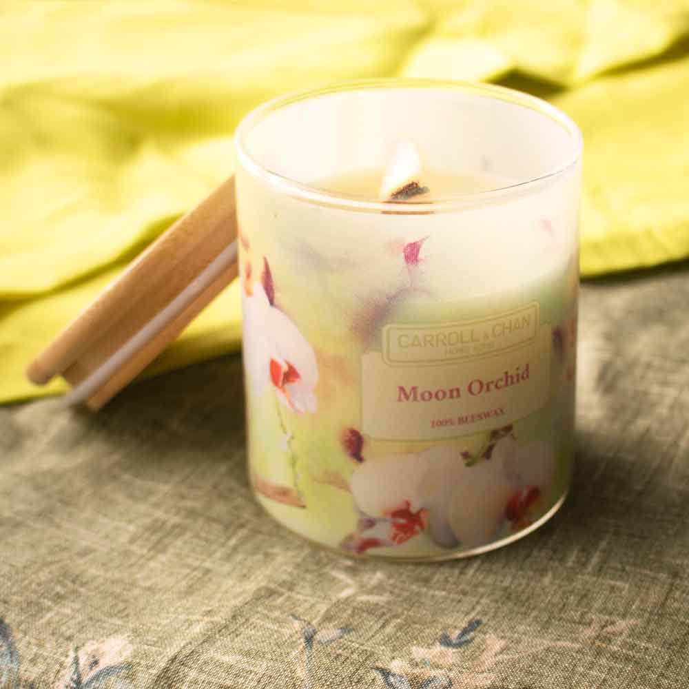 شمعة جرة Moon Orchid مصنوعة من شمع العسل بنسبة 100% ومكتملة بفتيل خشبي معتمد من FSC ومصنوع بطريقة مستدامة ويتميز بانبعاث خفيف.