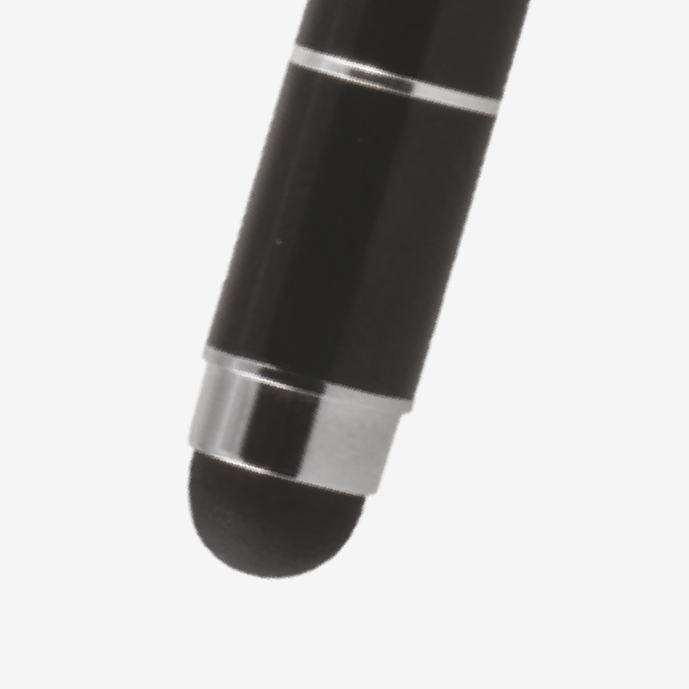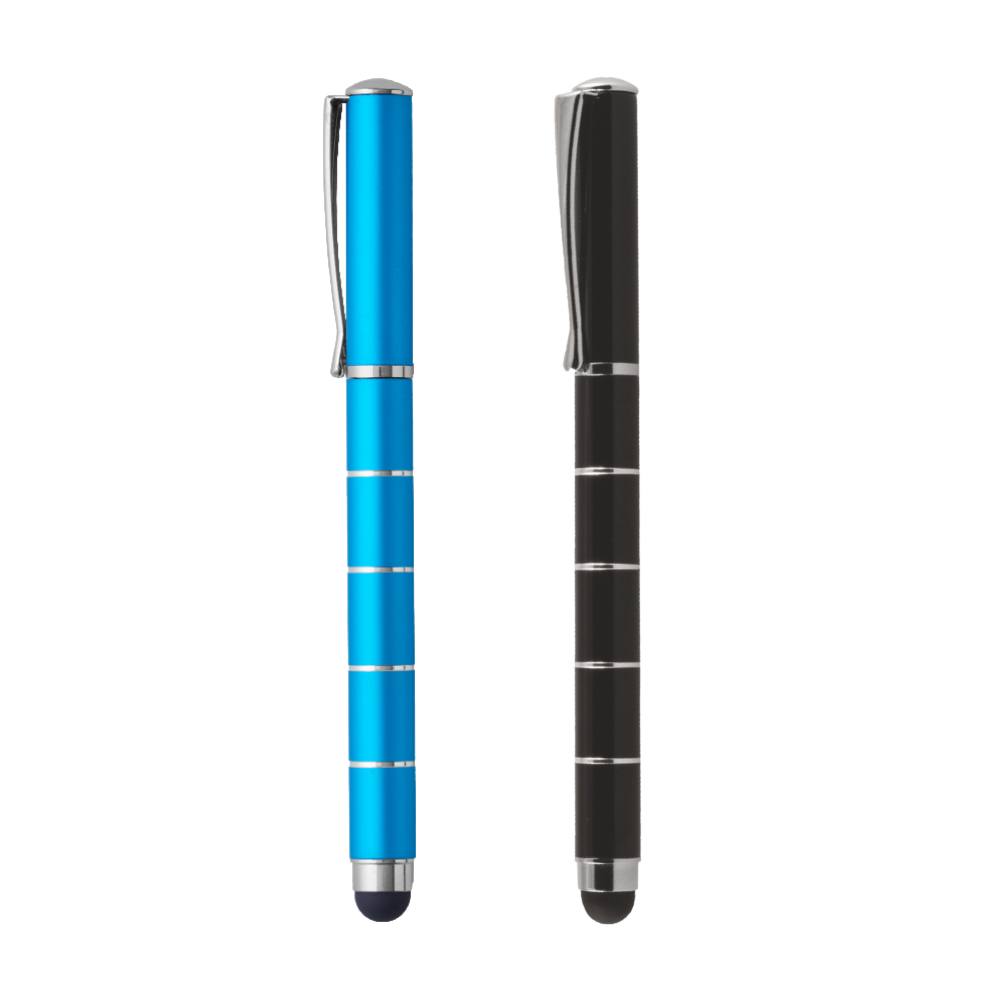 Single ballpoint pen with stylus. Available in turquoise blue and black.