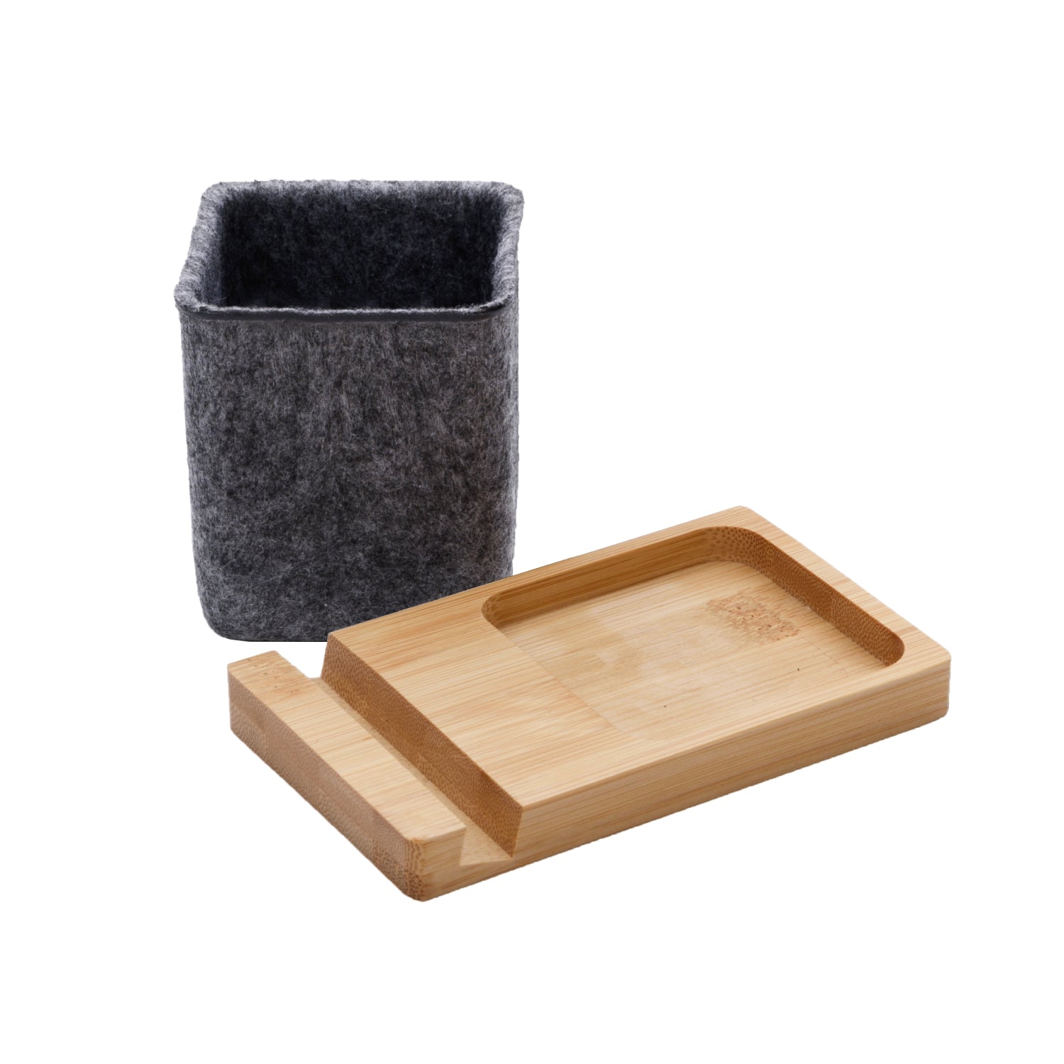 Bamboo desk organizer with mobile phone holder and RPET felt pen holder.