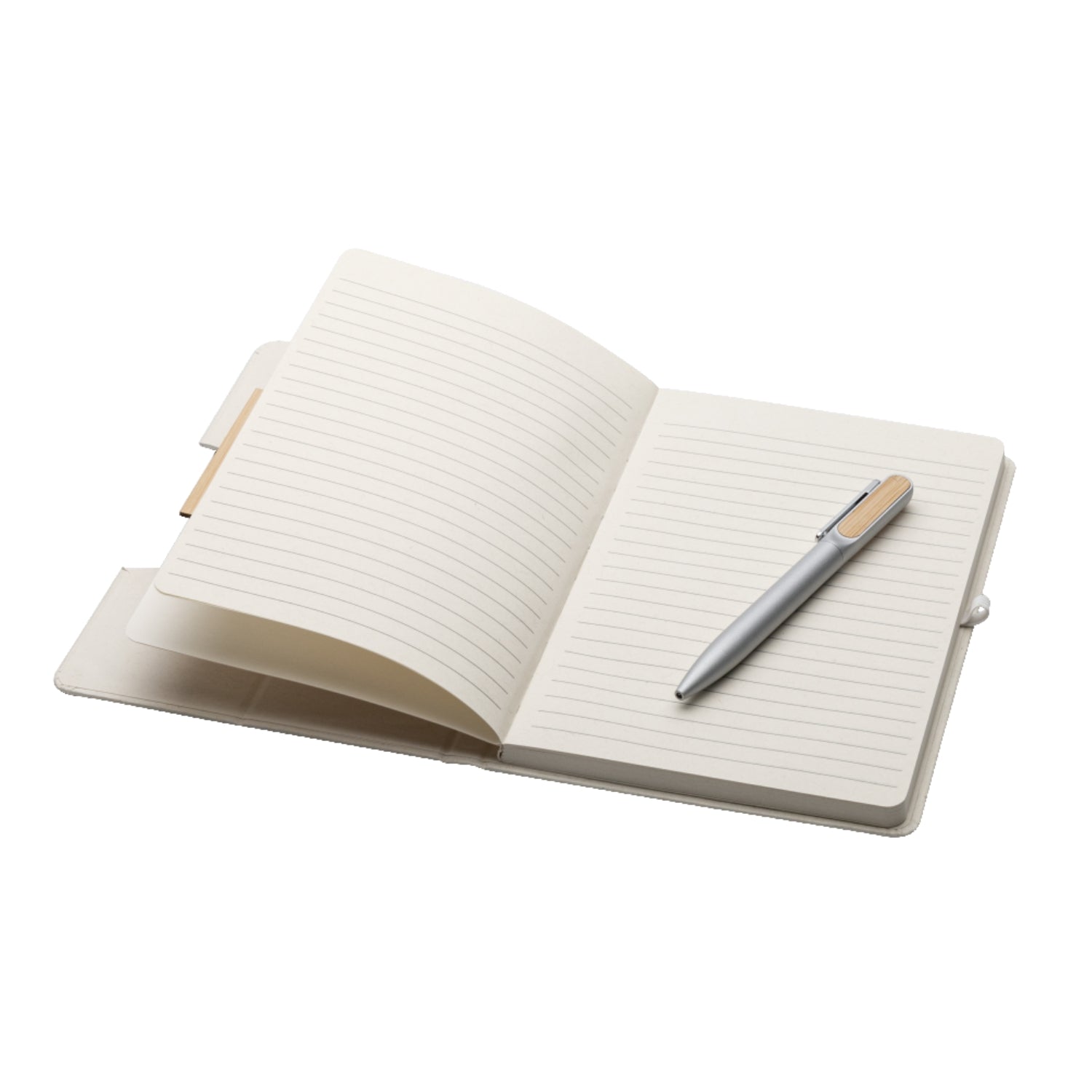 This product combines an eco-friendly A5 notebook with an eco-friendly pen making it a set with a low carbon footprint. The notebook is made by recycling milk cartons, and it includes 80 lined sheets of 80 GSM recycled milk carton paper. It includes an innovative notebook cover, which can be folded and used as a smartphone holder. The pen is made of metal but includes a sustainable bamboo trim which is perfect for laser engraving.