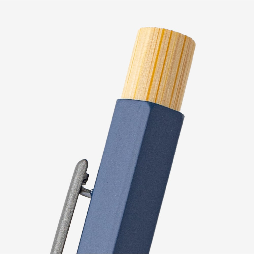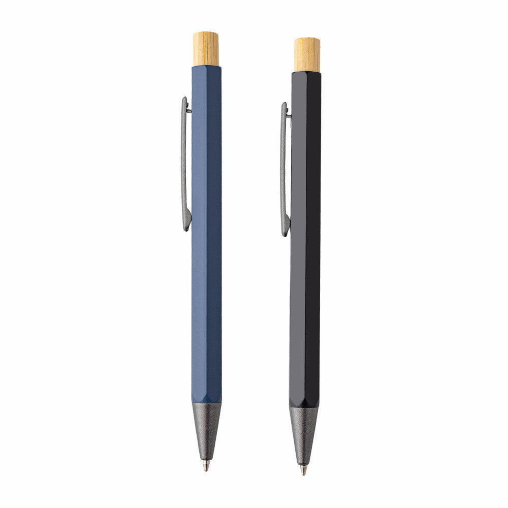 Modern aluminum pen with bamboo button and polished finish. Blue ink refill.